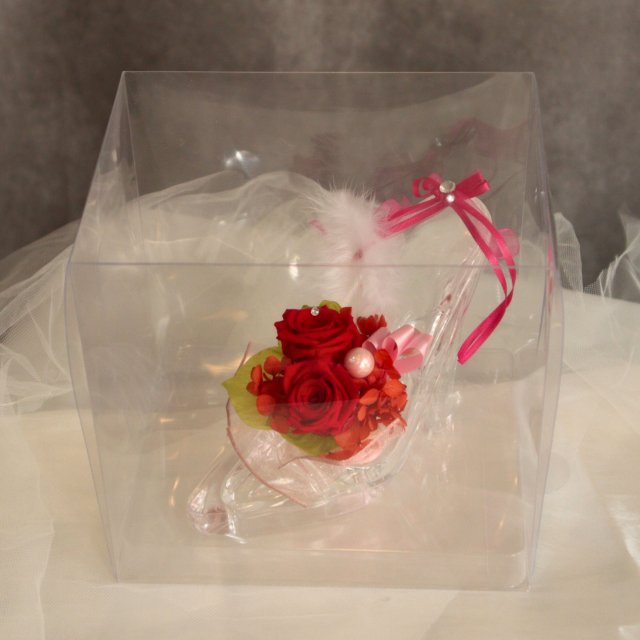 クリアなアクリルのハイヒールにプリザーブドフラワーやリボンをあしらったシンデレラハイヒール(レッド)は、特別な日の贈り物にぴったりです。